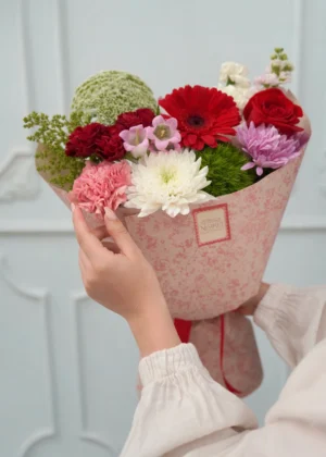Un Bouquet que evoca el más dulce jardín, diseñado con flores frescas 100% naturales cuidadosamente seleccionadas en tonalidades primaverales y empacado al estilo corearo. Perfecto para sorprender a tu persona favorita.