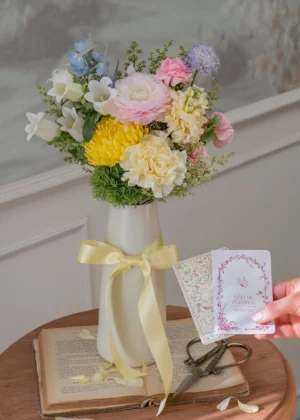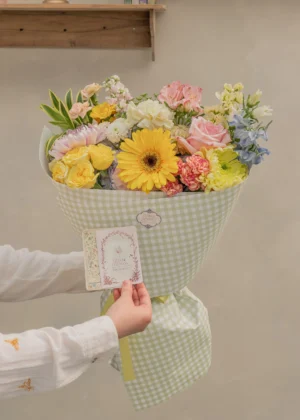 Un Bouquet que evoca el más dulce jardín, diseñado con flores frescas 100% naturales cuidadosamente seleccionadas en tonalidades primaverales y empacado al estilo corearo. Perfecto para sorprender a tu persona favorita.