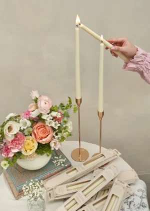 Set velas para candelabro en cera de soya color ivory con fragancia a vainilla francesa. Un toque especial en caja x2 unidades para traer brillo a la mesa y complementar un detalle que despierta los sentidos.