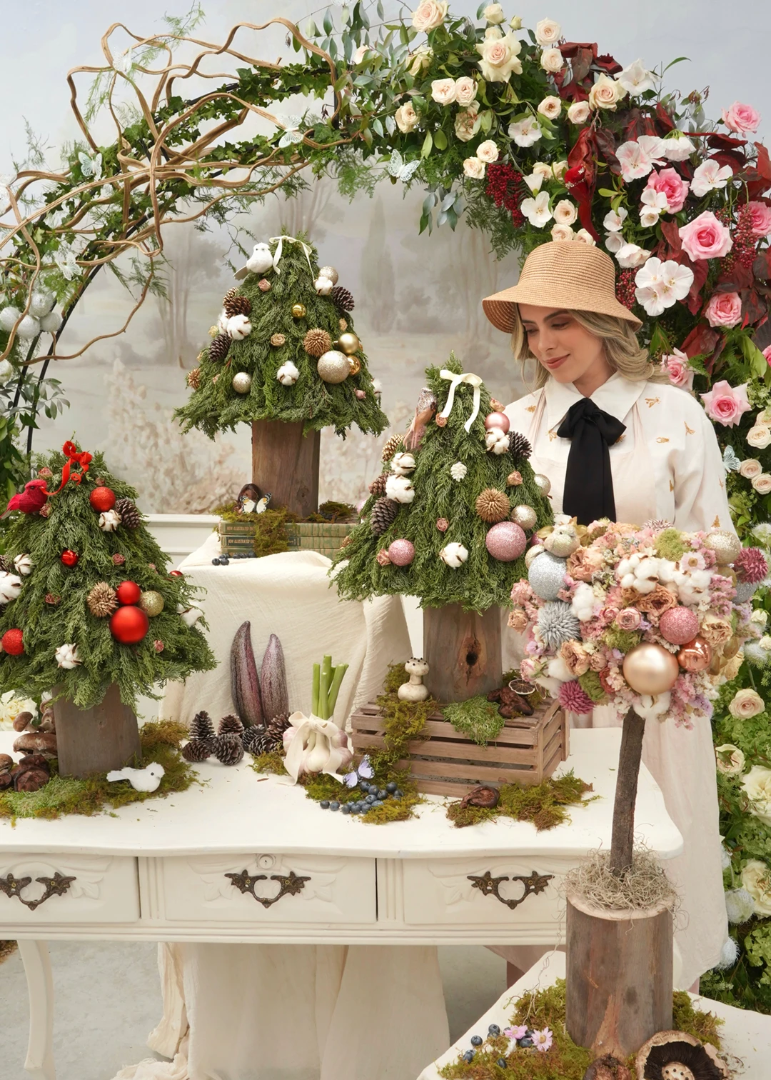 Árbolito de navidad hecho a mano con pino natural, apliques en flores secas, algodón y ornamentos navideños sobre tronco macizo 100% natural. La pieza perfecta para darle un toque muy exclusivo, orgánico y acogedor a tus espacios en estas fiestas.