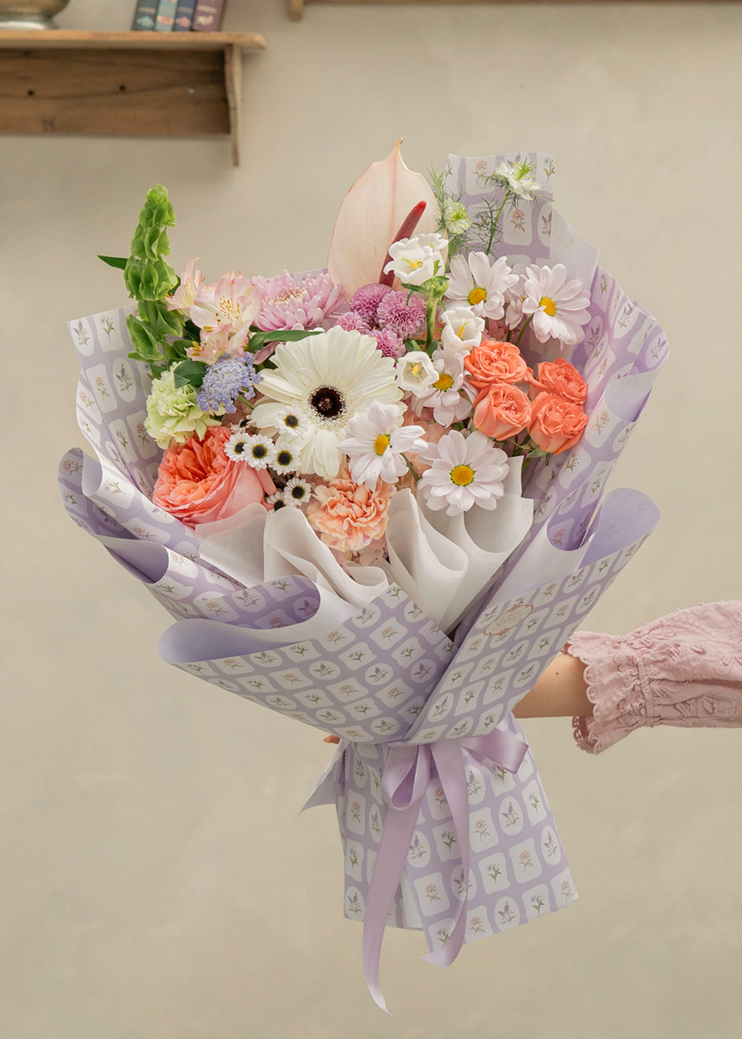 Adorable Bouquet de flores frescas 100% naturales, en colores primaverales con tonos lilas y naranjas, delicadamente empacado. Perfecto para celebrar a tu persona favorita.