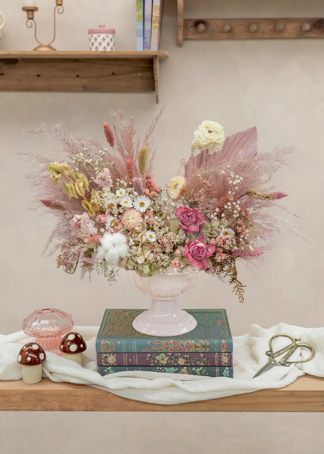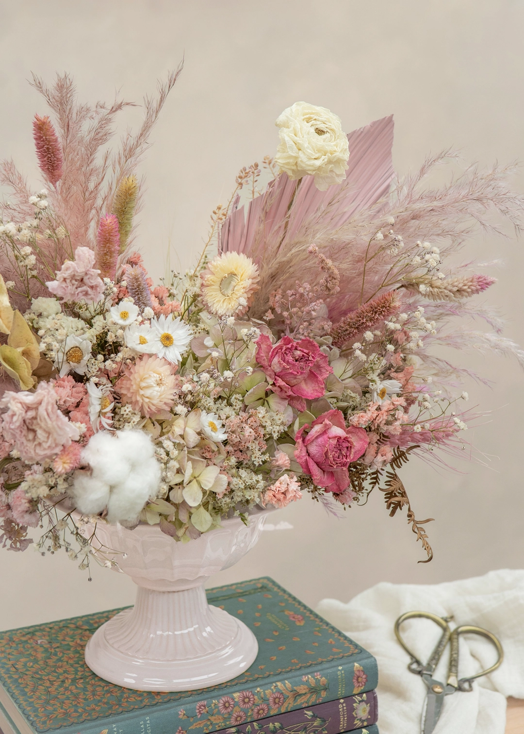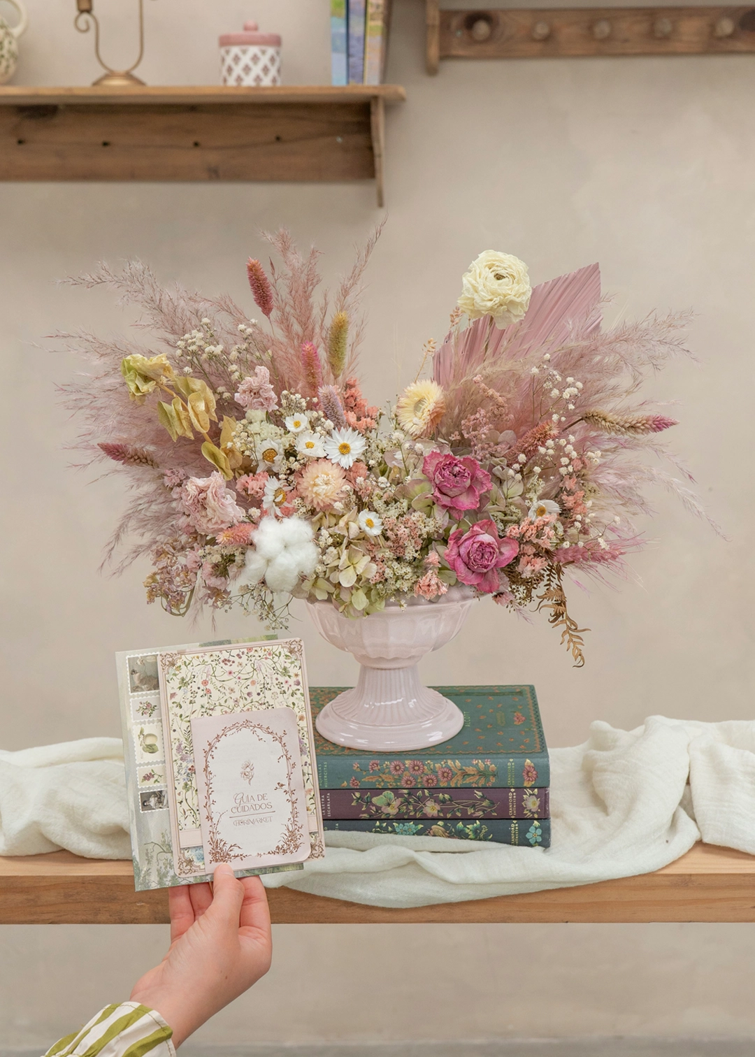 Una composición al estilo inglés con flores 100% naturales secas y preservadas de larga duración en tonos rosas, blancos y fucsias, sobre elegante caliz en cerámica artesanal color palo de rosa. Perfecta para elevar tus espacios con un sutil y delicado pop de color que permanece en el tiempo.