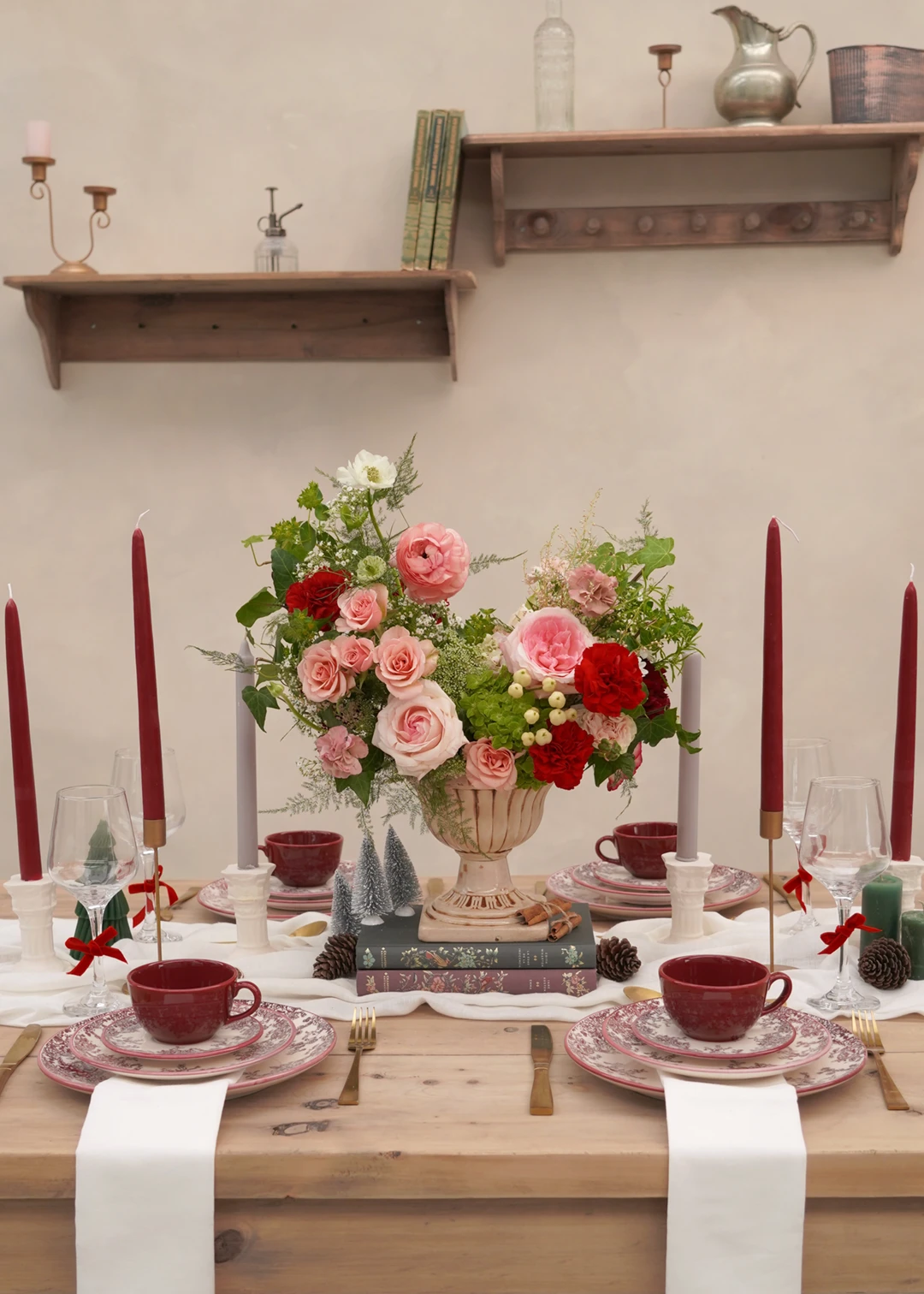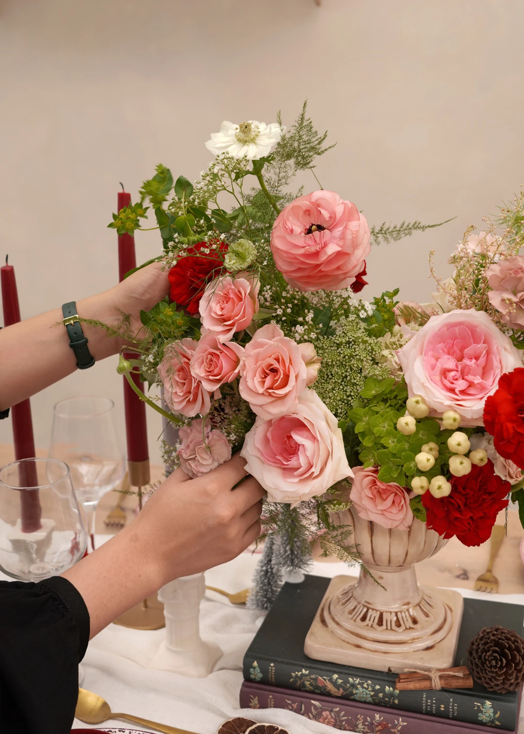 Composición floral al estilo inglés hecha con flores frescas de lujo 100% naturales en colores de temporada, realizada en Cáliz de cerámica estilo vintage (podrá presentar ligeras imperfecciones al ser hecho artesanalmente). Una pieza perfecta para decorar tus espacios con un toque exclusivo en estas fiestas o para sorprender a esa persona especial.