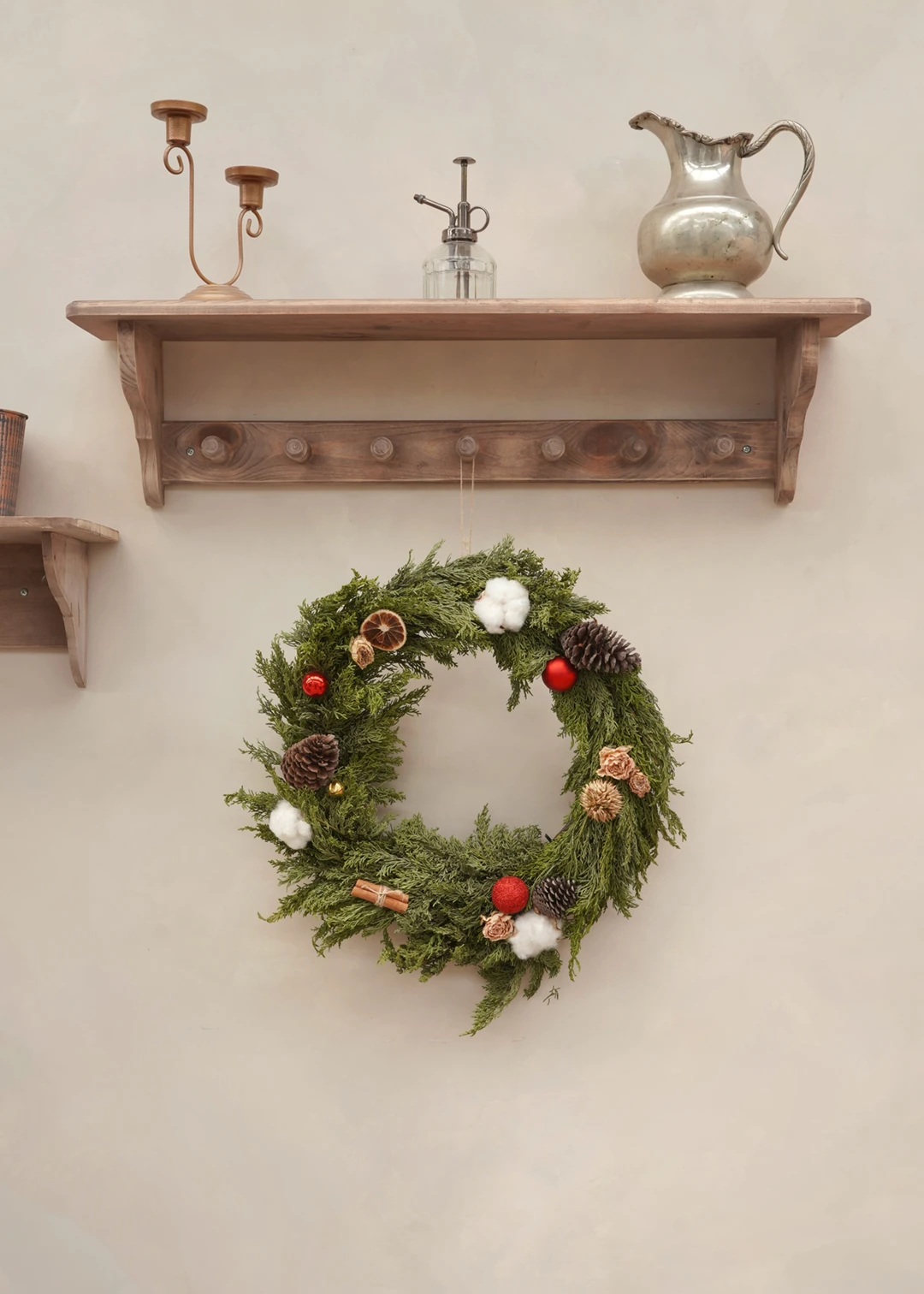Encantadora corona navideña en pino 100% natural con apliques y ornamentos de temporada, hecha a mano.