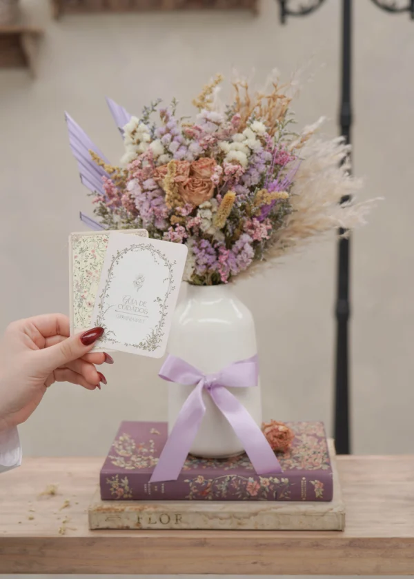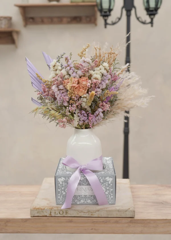 Composición en flores secas y preservadas, 100% naturales y de larga duración. En tonalidades lila con combinaciones boho que le darán un toque de eternidad muy especial a tus espacios.